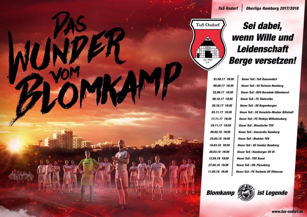 Höhepunkt war der Aufstieg in die Oberliga Hamburg und der souveräne Klassenerhalt. Auf dem Weg dahin gab es viele Höhen und Tiefen sowie legendäre Fußball-Freitagabende am Blomkamp in Alt-Osdorf. TuS Osdorf ist einzigartig. Der Blomkamp ist Legende. Und so kommen heute die Zuschauer aus dem gesamten Hamburger Westen. Um diesen besonderen Club noch bekannter zu machen und noch mehr Menschen für die unglaublichen Fußballabende am Blomkamp zu begeistern, startet in diesen Tagen eine Werbekampagne: Angelehnt an einem anderen Fußballwunder, wurde in eindrucksvollen Bildern eine Collage über das „Wunder vom Blomkamp“ erstellt, die das besondere Blomkamp-Feeling vermittelt. Dazu wird es Großflächenplakate, Poster und Social-Media-Aktivitäten geben.